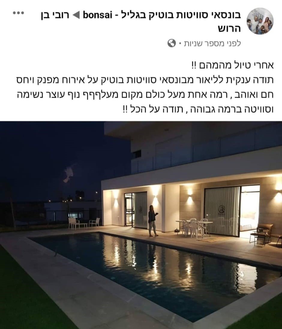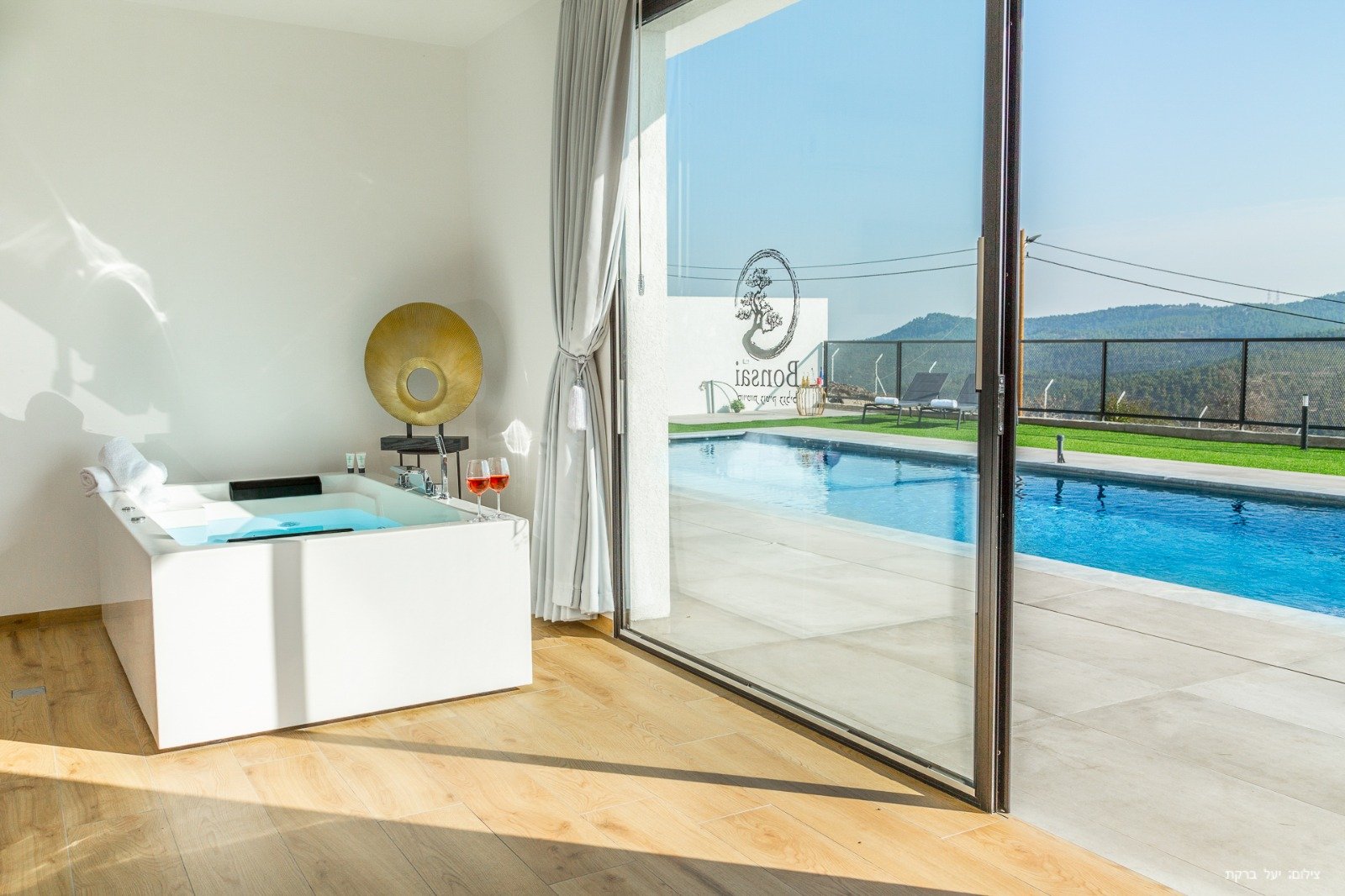 ברוכים הבאים לבונסאי. בגליל העליון, באחד האזורים היפים בארץ, על קצה הר המשקיף אל העמק והכנרת, שתי סוויטות זוגיות, יוקרתיות ומאובזרות לפרטי פרטים ממש כמו באומנות הבונסאי. במתחם בריכה מחוממת ומקורה הצופה לנוף המרהיב, פינת ברביקיו ועוד המון פינוקים שיחכו לכם בסוויטה. אנו מזמינים אתכם לחוויית אירוח שונה מכל מה שהכרתם.